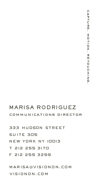 Done while at temping at Vision On, a retouching firm. I created a business card design using their existing style guidelines - font and logo.